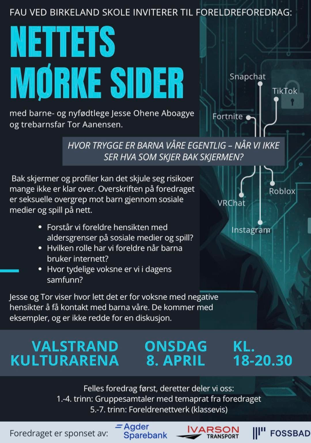 Birkenes IL informerer om viktig foreldreforedrag for foreldre med barn på 1.-7.trinn. Arrangementet er på Valstrand kulturarena rett etter påske, der Jesse Ohene Aboagye og Tor Aanensen holder foredrag for foreldre om risiko på nett.
